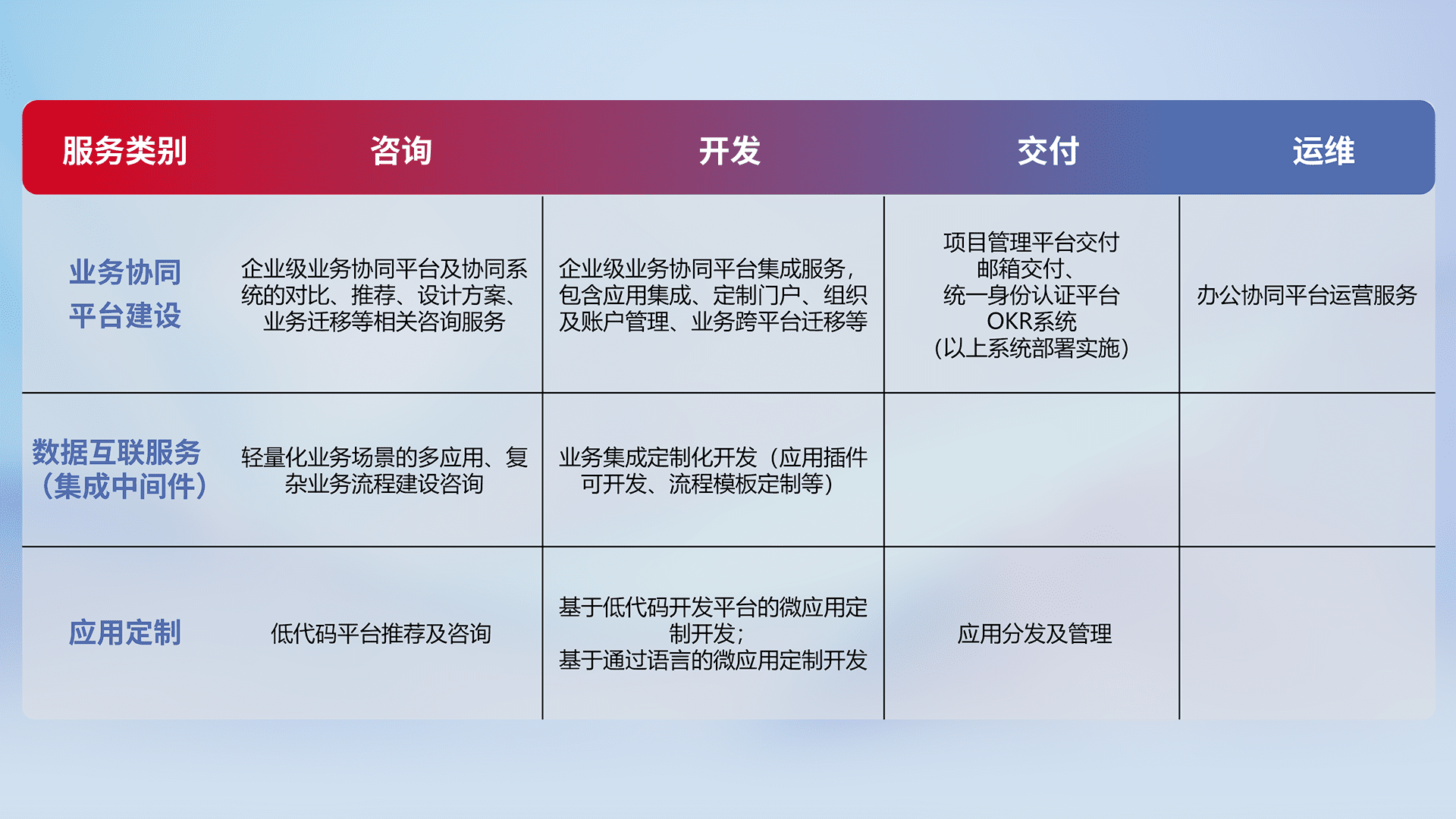 针对钉钉、、、、企微、、IDaas等平台级产品提供产品的规划、、、方案、、交付、、定制化开发等服务,,,实现如统一协同办公、、、、智能客户服务、、、、混合会议管理、、、智能数据查询、、等业务场景,,实现数字化转型。。。。